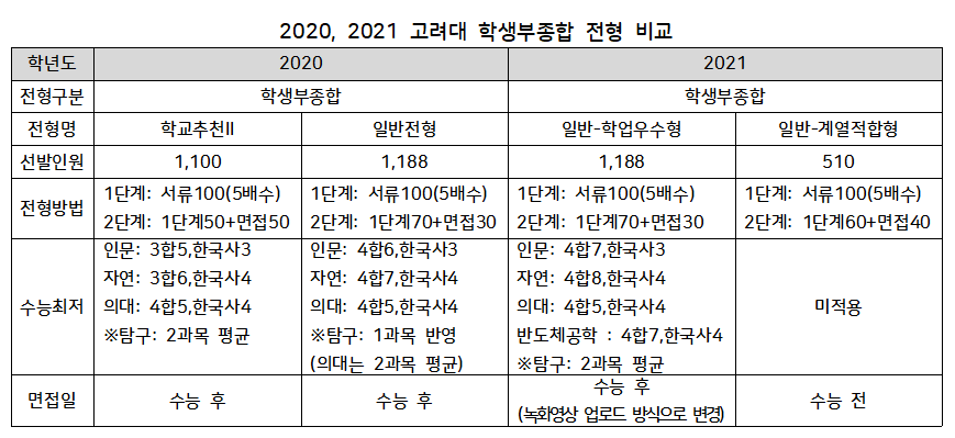 안그래도 선발인원은 증가하고 전형방법도 단계별 전형에서 일괄전형으로 단순화되었으며 수능최저학력기준이 강화되었는데 면접까지 Pass/Fail 방식으로 평가되었다.... 2021학년도 고려대 학생부교과전형에서 어떤 요소가 가장 큰 영향을 미치게 될까요?