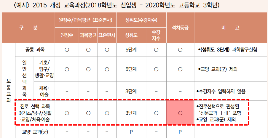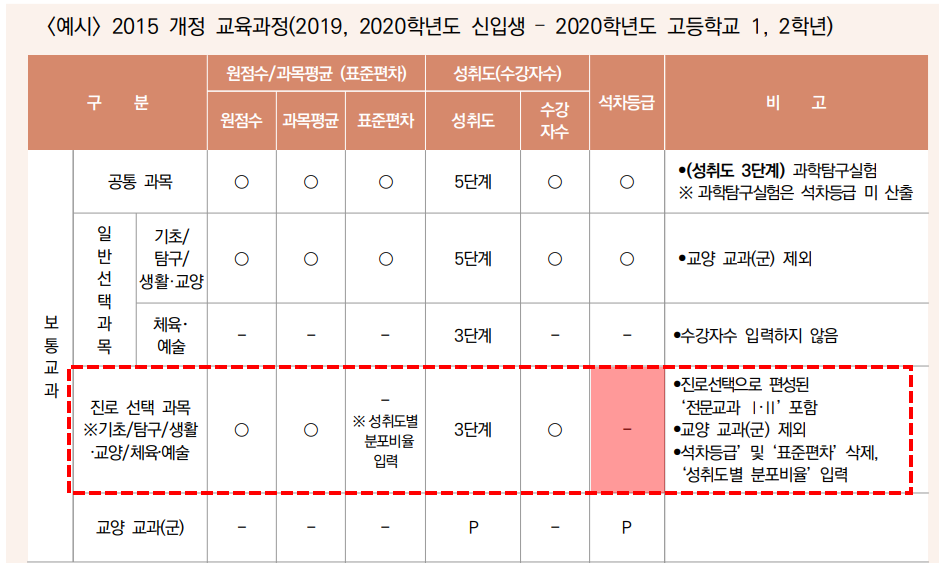 즉, 2021학년도까지는 진로선택과목에서도 석차등급이 표기되었지만, 2022학년도부터는 성취도만 표기가 되기 때문에 이런 변화가 학생부교과전형을 비롯한 종합전형 등에 영향을 미칠 것으로 예상이 됩니다.