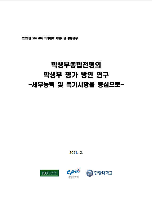 지난 2월 2020년 고교교육 기여대학 지원사업의 일환으로 건국대, 중앙대, 한양대의 입학사정관 등이 공동 연구 발표한 『학생부종합전형의 학생부 평가 방안 연구 - 세부능력 및 특기사항을 중심으로 -』에서 그 대답을 확인할 수 있습니다.