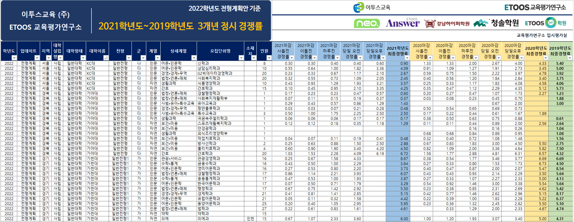 그래서 경쟁률이 중요하다고는 하지만 마감 직전 경쟁률만을 보고 지원하는 것은 지양하시기 바랍니다. 이런 이유에서 이전의 경쟁률은 어땠는지 참고하실 수 있는 자료를 업로드해 드립니다. 이투스에서 공개한 자료인데요, 3개년 동안의 정시 경쟁률을 정리한 자료입니다. 다만, 올해 2022학년도 정시 모집은 전형계획을 기준으로 했기 때문에 확인이 필요하며, 특히 수시 이월이 되고난 후의 인원을 꼭 확인하시고 지원하실 때 참고하시기 바랍니다.