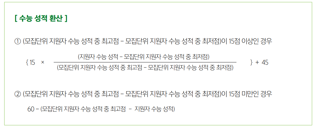 이런 변화의 영향으로 수능 성적만이 아니라 학교생활기록부까지 챙겨야 하는데다 지원자들의 성적이 어떻게 되는지에 따라 환산점수에 따른 입시 결과가 달라지게 되어... 이전보다 예측이 더욱 어려워졌습니다.