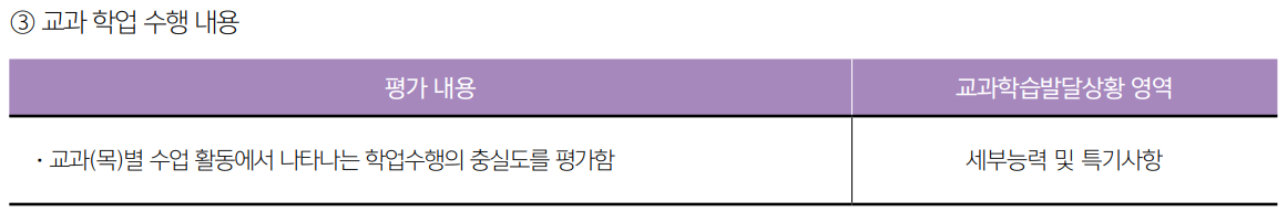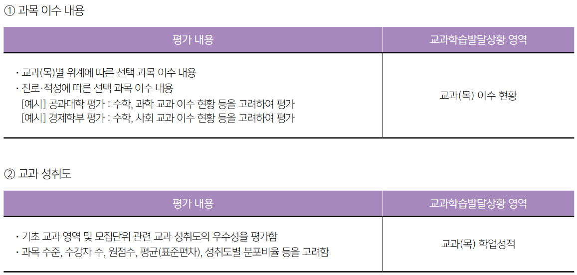 "학교생활기록부의 교과학습발달상황(① 교과 이수 현황, ② 교과 학업성적, ③ 세부능력 및 특기사항)만 반영하여 모집단위 관련 학문 분야에 필요한 교과이수 및 학업수행의 충실도를 평가함"이라고 밝히고 있습니다.
