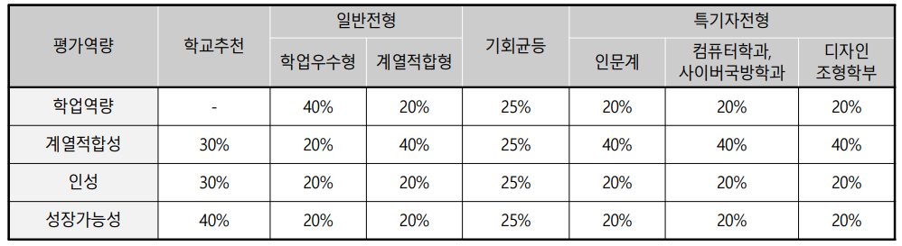 올해의 서류평가 평가 역량과 반영 비중, 수능최저학력기준은 전년과 동일합니다. 역시 전년과 유사한 결과가 나타날 가능성이 높죠. 물론... 실제 수능 난이도에 따른 수능최저학력기준 충족률에 따라 작년과 또 달라질 수도 있습니다.