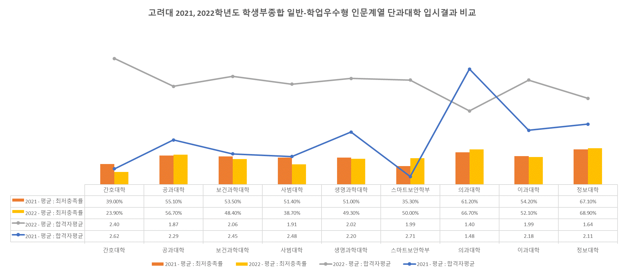 수능최저학력기준 충족률이 낮아지면 일반적으로 합격자들의 성적이 하락한다고 알고 있었는데... 고려대의 경우에는 반대 현상이 일어난 겁니다.