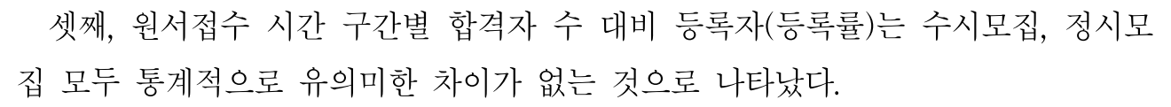 중요한 것은 "합격자 대비 등록률은 수시와 정시 모집 모두에서 통계적으로 유의미한 차이가 없다"는 점입니다. 물론, 이런 내용은 제가 개인적인 경험에서 나오는 이야기가 아니라 경희대에서 지난 2019년 연구하여 공개한 "대입 원서접수 시간 구간별 합격률 및 등록률 차이 분석 연구" 결과의 내용입니다.