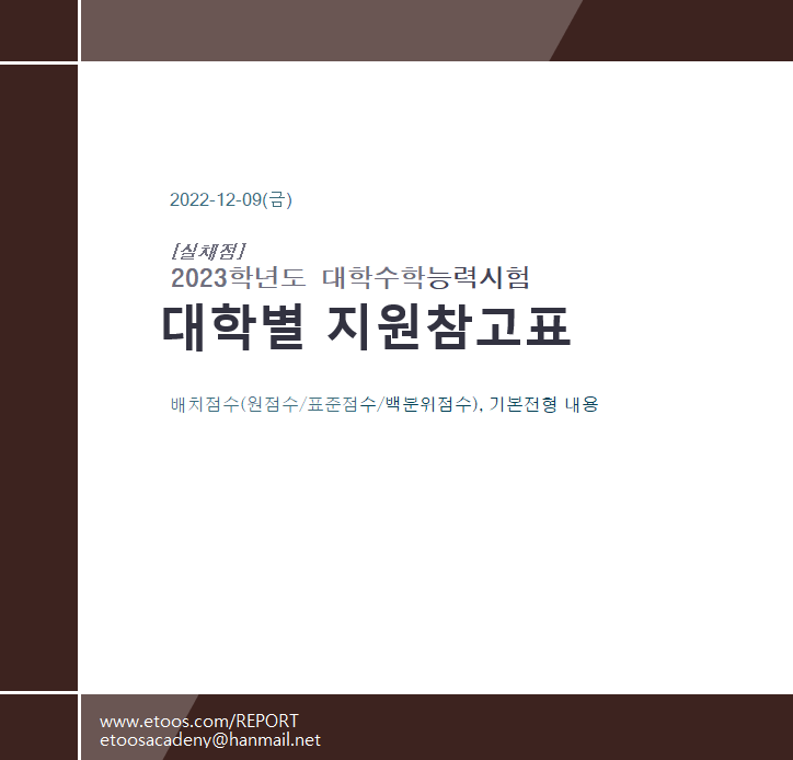 이투스에듀에서 발표한 2023학년도 수능 실채점 기준 상위누적백분위와 지원참고표 자료를 올려 드립니다. 통합 수능 2년차지만 여전히 여러 입시기관들도 헤메는 모습이 보입니다. 그들의 문제가 아니라 평가원의 문제라 해결도 어려운 상황이라 참 답답하네요. 수험생과 학부모님들은 어떨지...